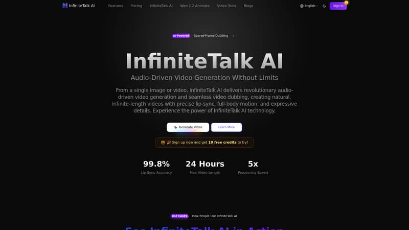 InfiniteTalk AI transforms images and audio into professional talking videos with 99.8% lip-sync accuracy. Create unlimited-length videos with natural expressions and body movements instantly.