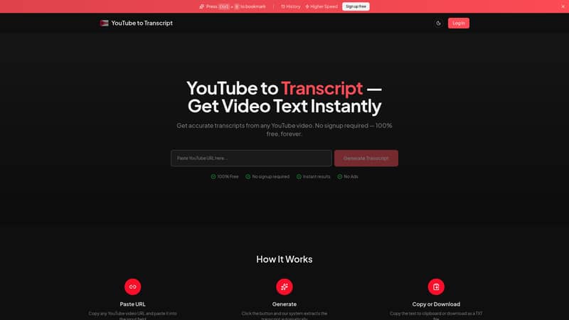 Convert any video with YouTube to Transcript, the fastest free tool to generate accurate text without signups. Get unlimited YouTube to transcript results now.
