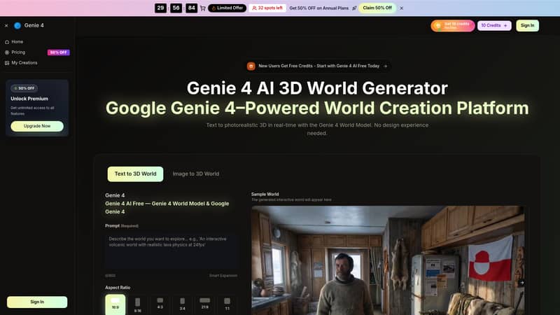 Create photorealistic 3D worlds in real-time with genie4 ai. Use the Genie 4 World Model to transform text or images into playable 720p environments at 24 FPS.
