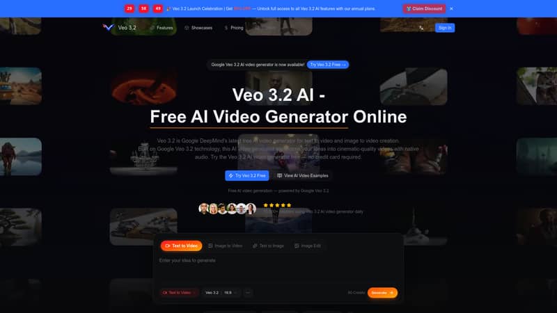 Free AI video generator powered by Veo 3.2. Generate high-quality videos from text with advanced AI video synthesis technology.